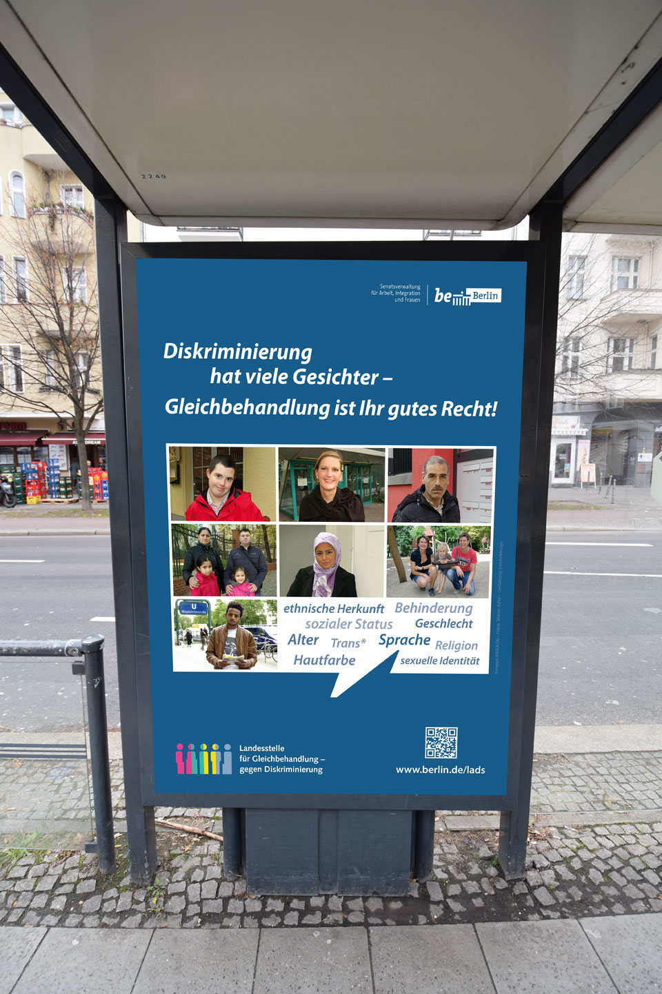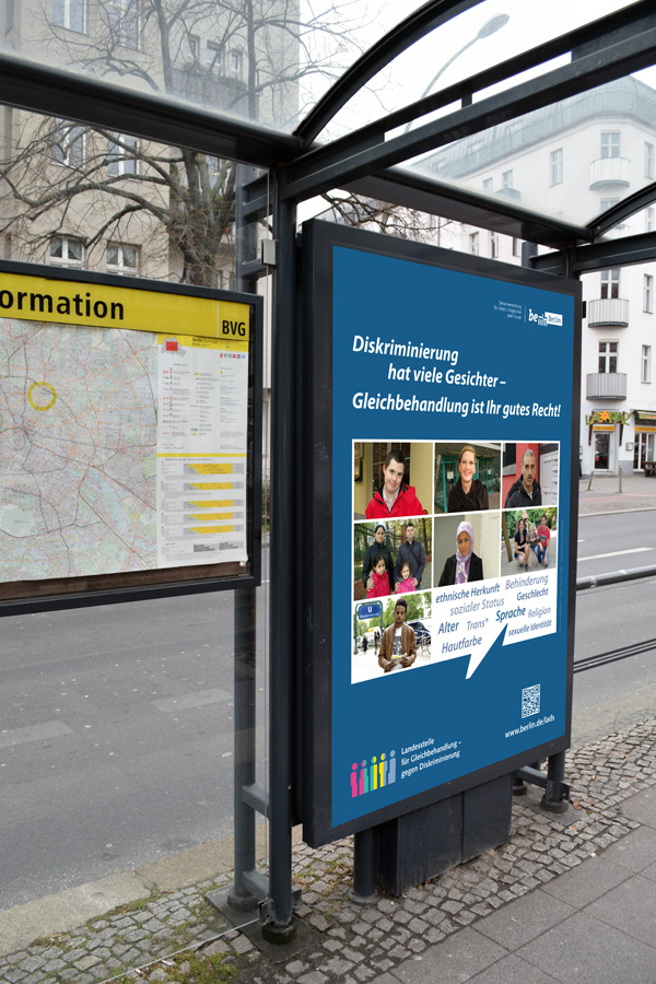 Seit Anfang Dezember 2016 setzt die Landesantidiskriminierungsstelle (LADS) ihre Sensibilisierungskampagne „Diskriminierung hat viele Gesichter – Gleichberechtigung ist ihr gutes Recht“ fort. Bis Ende des Jahres werden im „Berliner Fenster“ in der Berliner U-Bahn Info-Spots gezeigt. Des Weiteren wurden in diesem Jahr Plakate für den Wartebereich (Vitrinen S-Bahn, U-Bahn, Straßenbahn) sowie für Litfaßsäulen von : : treicheldesign entwickelt.